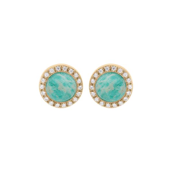 BO TIGE PLAQUÉ OR CABOCHON CONTOUR OXYDES BLANCS SERTIS PIERRE AMAZONITE VÉRITABLE