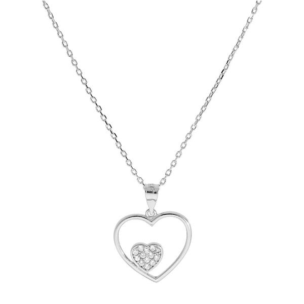 COLLIER ARGENT RHODIE PENDENTIF COEUR EVIDE AVEC PETIT COEUR OXYDES BLANCS SERTIS 40+5CM