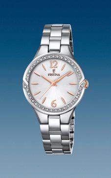 MONTRE FESTINA FEMME - BOITIER 28.5 MM EN ACIER SERTI D'OXYDES DE ZIRCONIUM - CADRAN ARGENTÉ - AIGUILLES ET INDEX ROSÉS - BRACELET ACIER - ÉTANCHE 50 M - GARANTIE 2 ANS