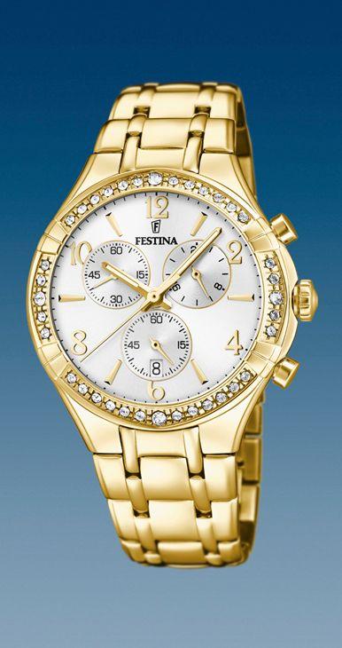MONTRE FESTINA FEMME CHRONO - BOITIER 39 MM EN ACIER PLAQUÉ OR ET OXYDES DE ZIRCONIUM - CADRAN ARGENTÉ - DATEUR - BRACELET PLAQUÉ OR - ÉTANCHE 50 M - GARANTIE 2 ANS