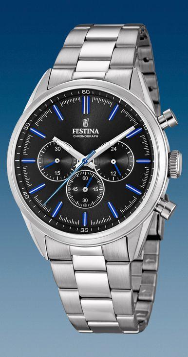 MONTRE FESTINA HOMME CHRONO - BOITIER 43.5 MM ACIER - CADRAN NOIR AVEC INDEX ET AIGUILLES BLEUS - BRACELET ACIER - ÉTANCHE 50 M - GARANTIE 2 ANS