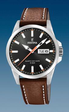 MONTRE FESTINA HOMME CLASSIQUE - 3 AIGUILLES - BOITIER 41 MM EN ACIER - CADRAN NOIR - DATEUR - BRACELET EN CUIR BRUN - ÉTANCHE 100 M - GARANTIE 2 ANS