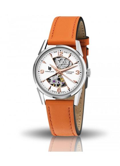 MONTRE DAME LIP HIMALAYA 33 MM SABLIER - Boitier : acier 316 L poli, diamètre de 33,5 mm - Cadran : blanc argenté avec index et chiffres arabes rose gold, aiguilles heures et minutes rose gold lumineuses, trotteuse rose gold - Verre : saphir - Bracelet : cuir lisse véritable vachette orange moyen - largeur 16 mm - Boucle : ardillon chromée - Mouvement : automatique analogique MIYOTA 8N24 21 rubis - Étanche : 50 mètres - Garantie 2 ans - Fabriquée en France : Besançon