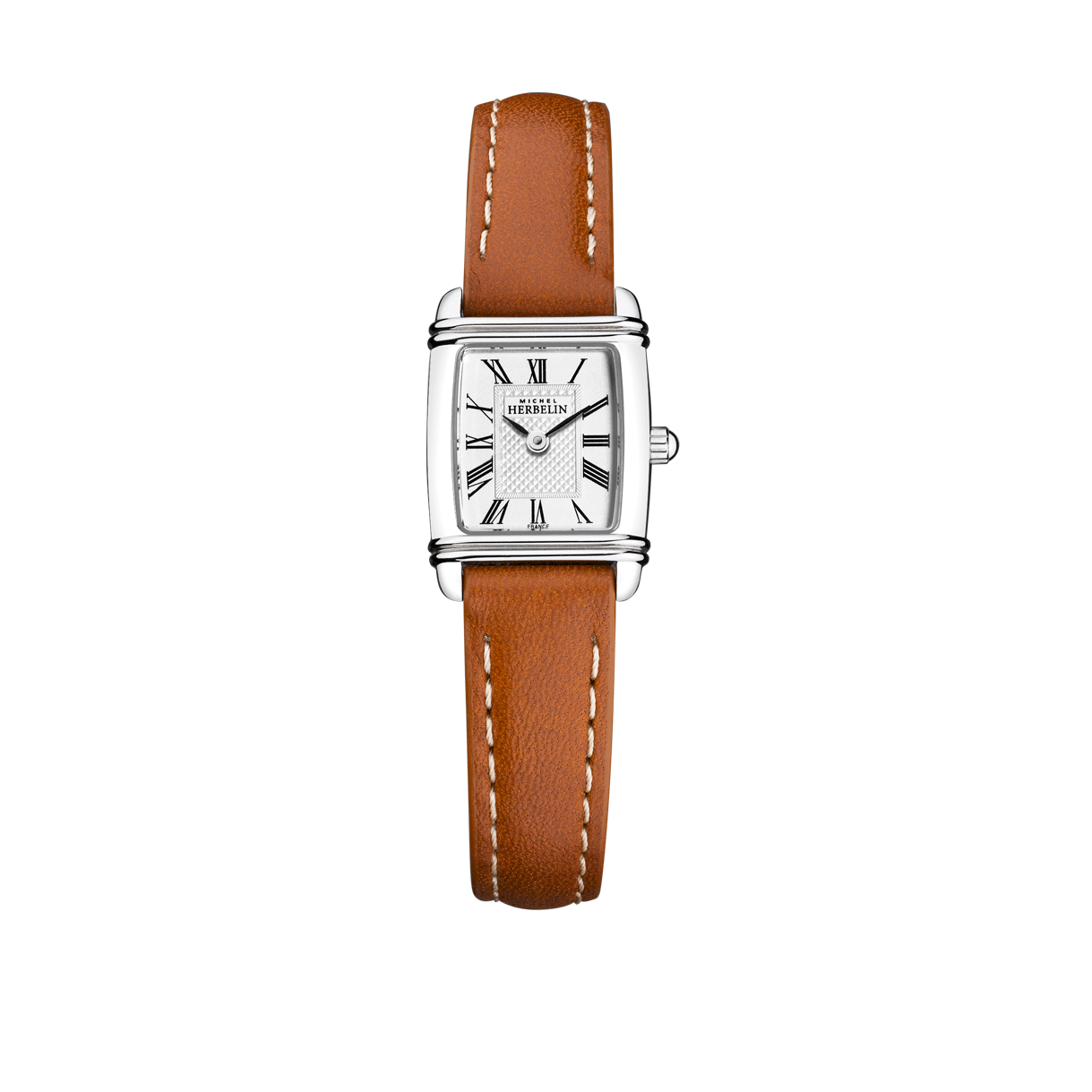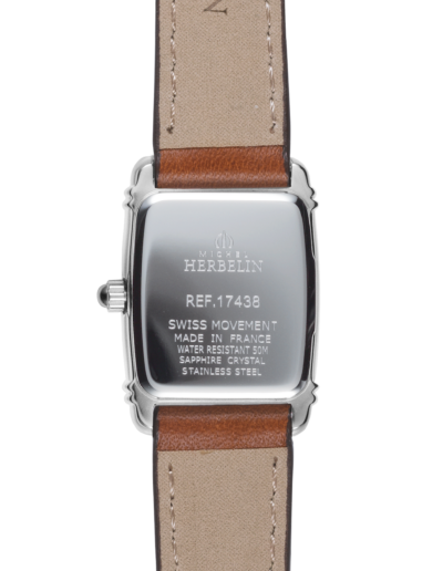 MONTRE DAME MICHEL HERBELIN - ART DECO - BOITIER ACIER FORME TONNEAU DIM 17,8 X 19,4 MM - CADRAN BLANC - VERRE SAPHIR - MECANISME QUARTZ SUISSE - BRACELET CUIR MARRON - ÉTANCHE 5 ATM - GARANTIE 2 ANS