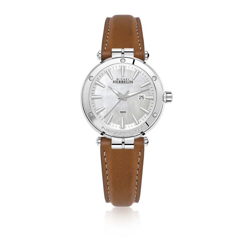 MONTRE DAME MICHEL HERBELIN - NEW PORT - BOITIER ACIER ROND DIAM.34,5MM - CADRAN NACRE - VERRE SAPHIR - DATEUR - MECANISME QUARTZ SUISSE - BRACELET CUIR MARRON - ÉTANCHE 10 ATM - GARANTIE 2 ANS