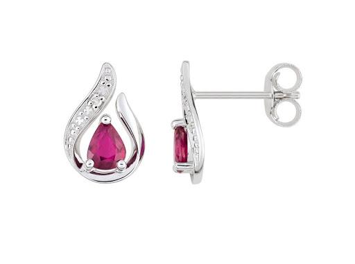 BOUCLES D'OREILLES EN OR GRIS RHODIÉ EN FORME DE FLAMME SERTIE AU CENTRE D'UN RUBIS POIRE DE 0.41 CT ET D'UN DIAMANT SUR CHACUNE DE 0.008 CT, POIDS 0.95 G