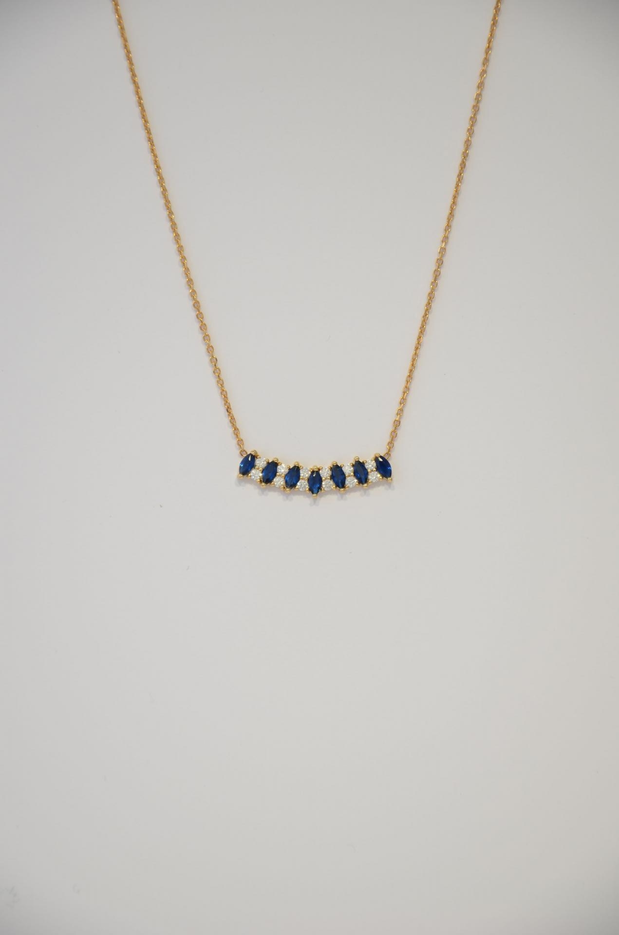 COLLIER PLAQUÉ OR BARRETTE 3 CM SERTIE OXYDES ET 7 SAPHIRS NAVETTES SYNTHÉTIQUES LONGUEUR 45 CM